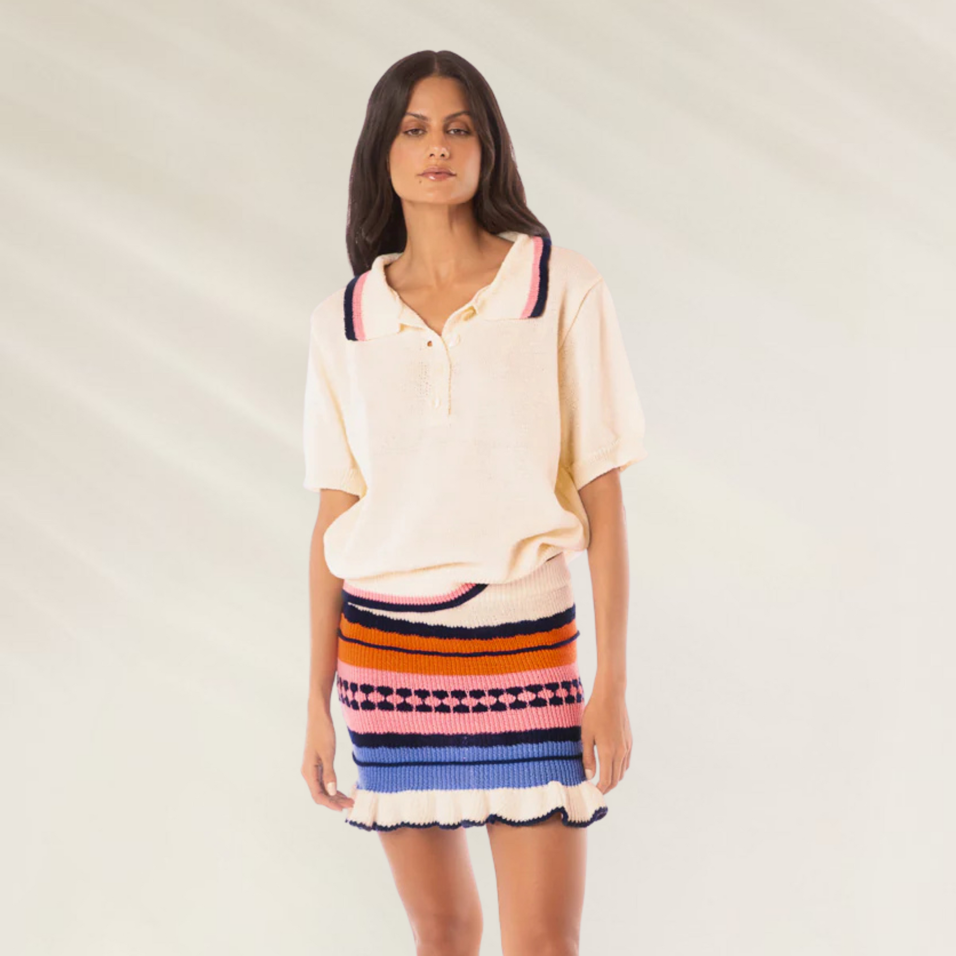 Maaji’s Nela polo shirt combines retro charm with modern comfort. With a relaxed “boyfriend” cut, classic collar and delicate knit details, this piece is ideal for complementing your beach or post-beach looks with a casual and elegant touch.