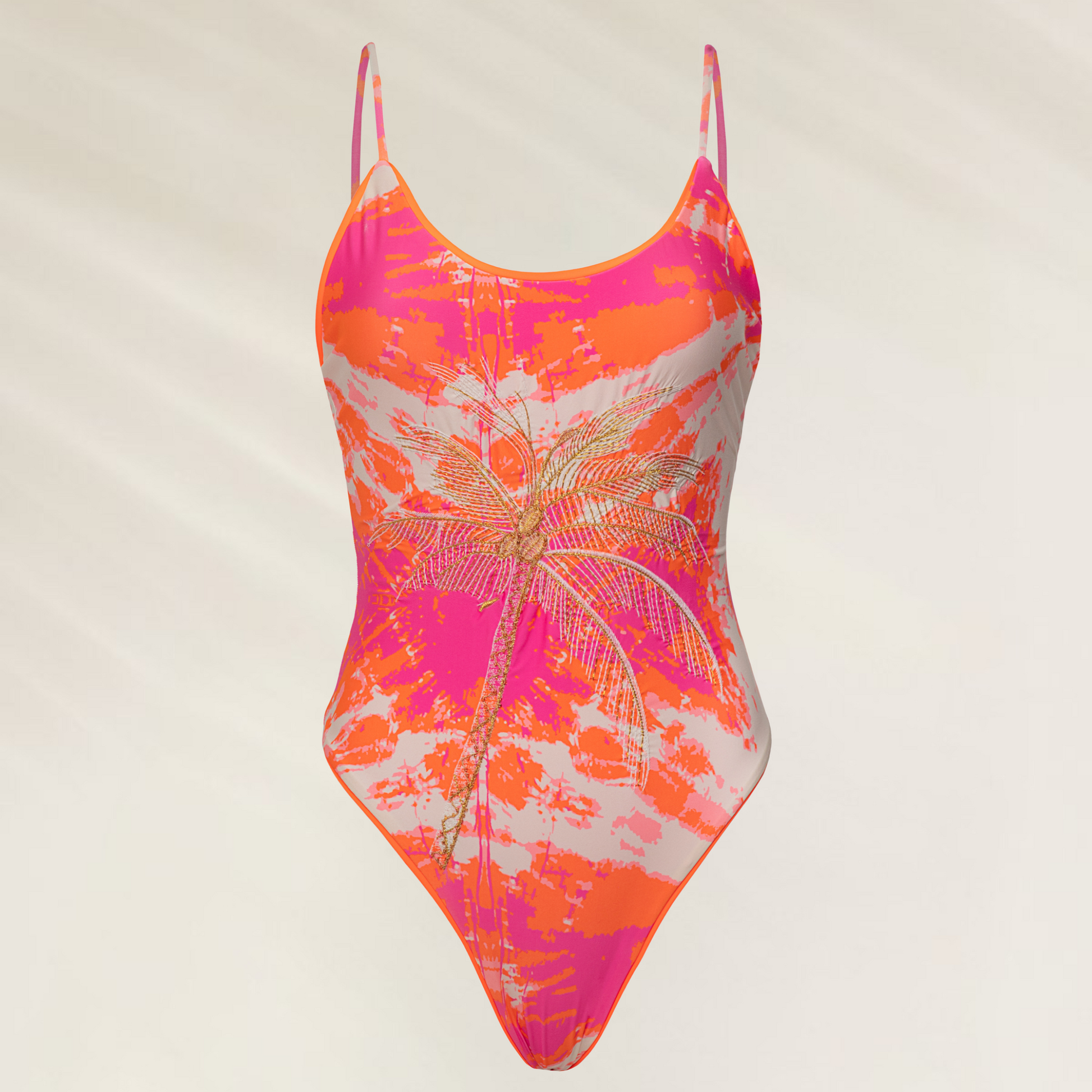The Lustre is the perfect swimsuit for those who love sporty elegance with a touch of originality. With a tie-dye palm tree print and reversible design, this piece combines functionality, comfort and style in one look — and even gives you two different looks!