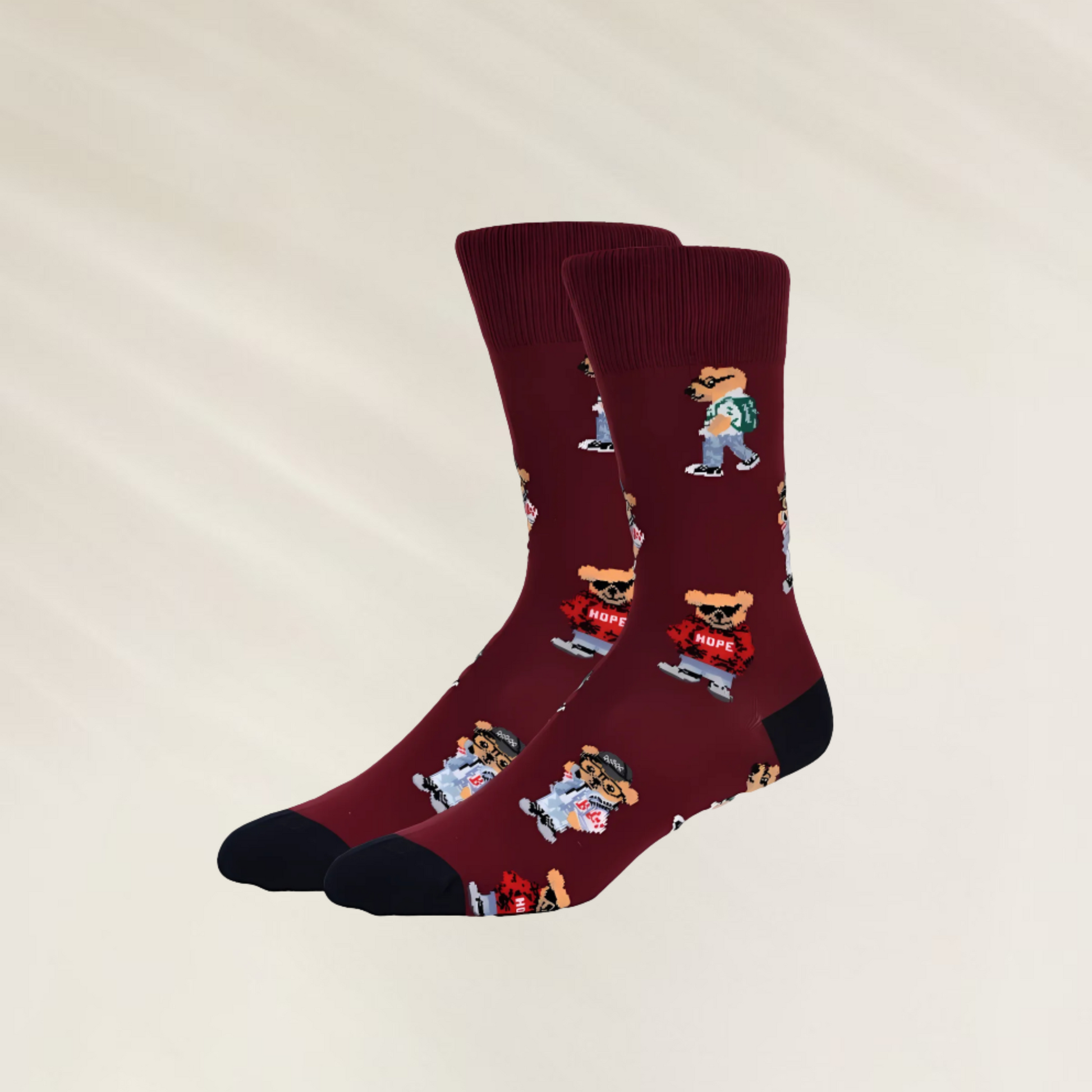Add a touch of personality to your look with these John Frank long socks. Made in Turkey from a soft cotton blend and durable materials, they’re ideal for those looking for comfort without sacrificing style. The fun urban bear pattern and burgundy base with contrasting detailing make these socks the perfect way to elevate any casual look.