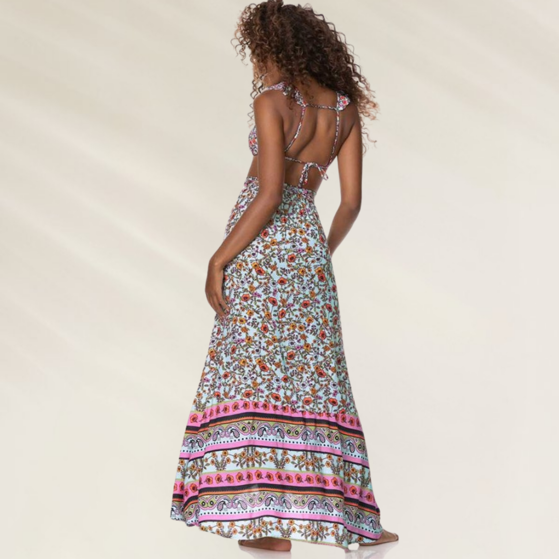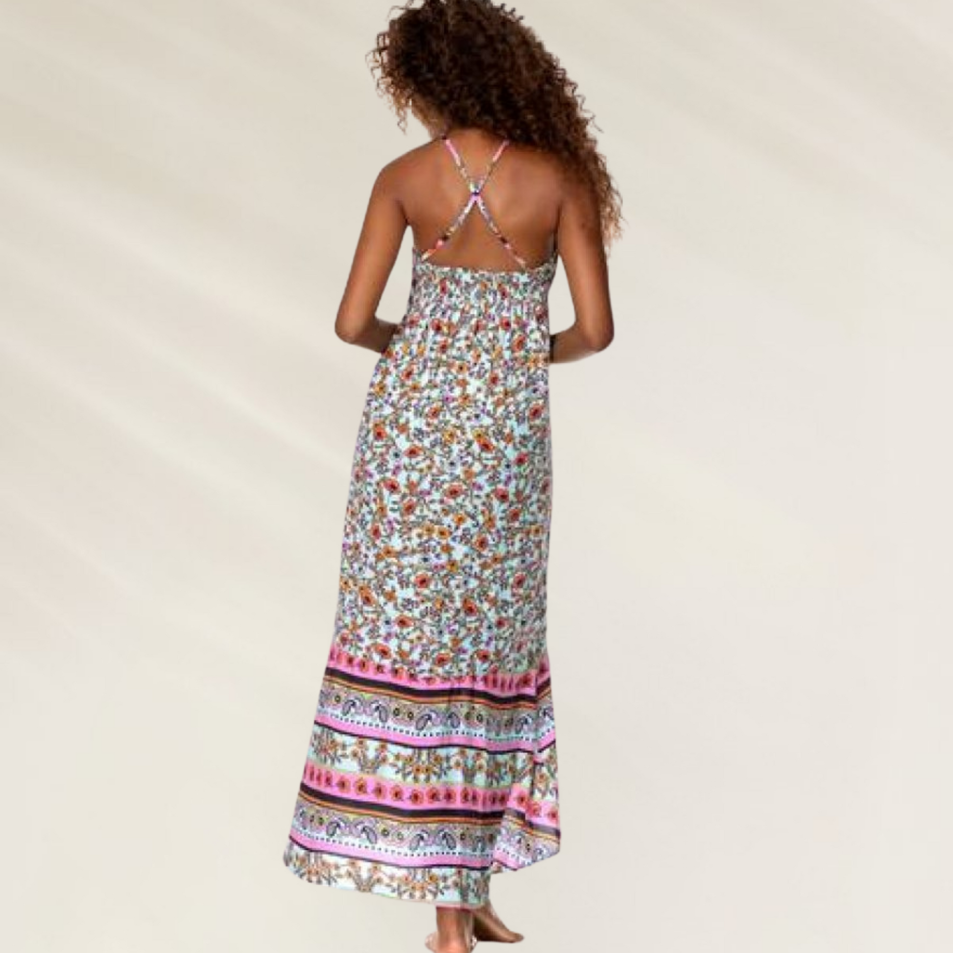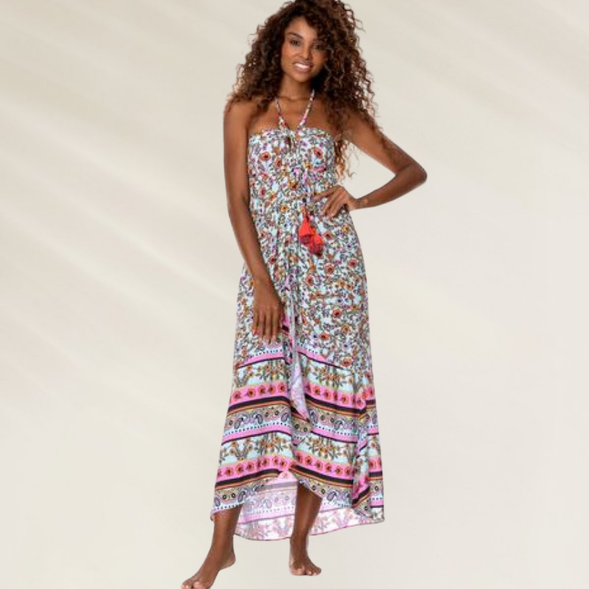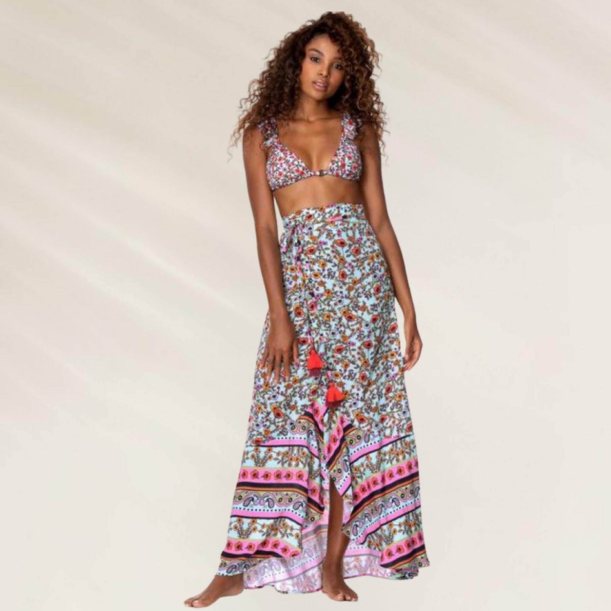 🎨 Vibrant floral print with ethnic pattern hem – A mix of colors that enhances your tan and brings energy to your look.