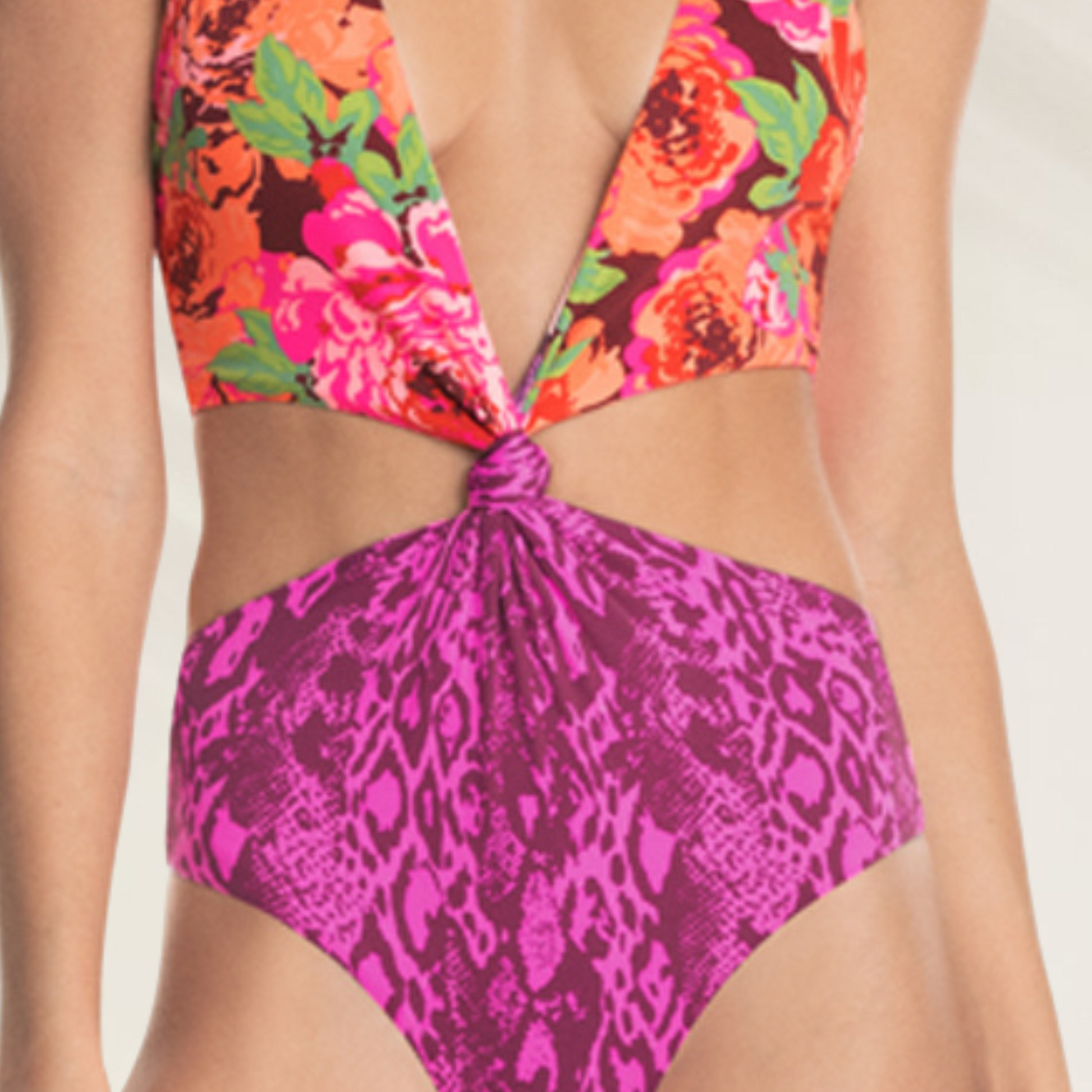 Dazzle in this reversible Maaji trikini, where vibrant floral print meets bold animal print to create a striking and unique look. With a deep V-neck and mid-cut bottom, it’s the ideal piece for those looking for tropical elegance with a bold twist. Made in Colombia with high-quality finishes.
