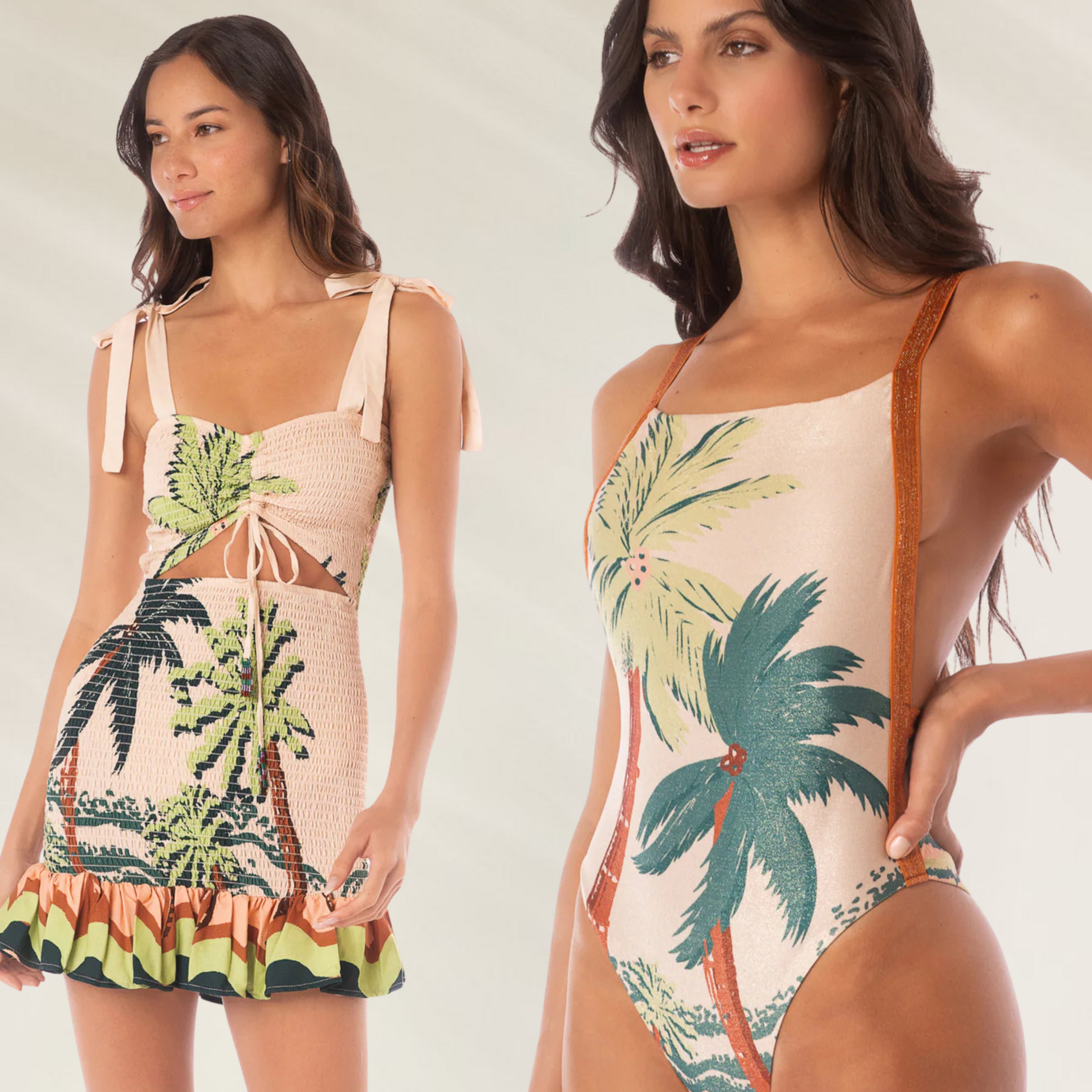 🌴 Association parfaite : robe et maillot de bain dans le même motif « Palm Glow » – idéal pour un look coordonné et sophistiqué