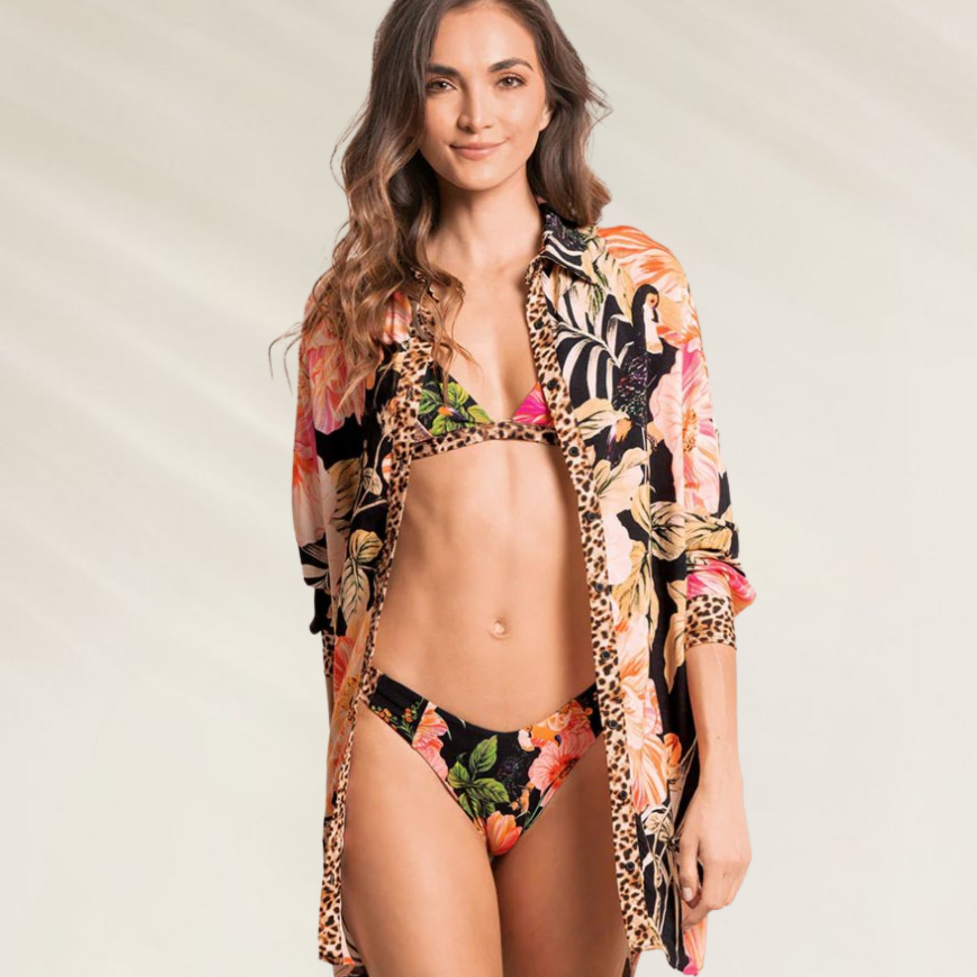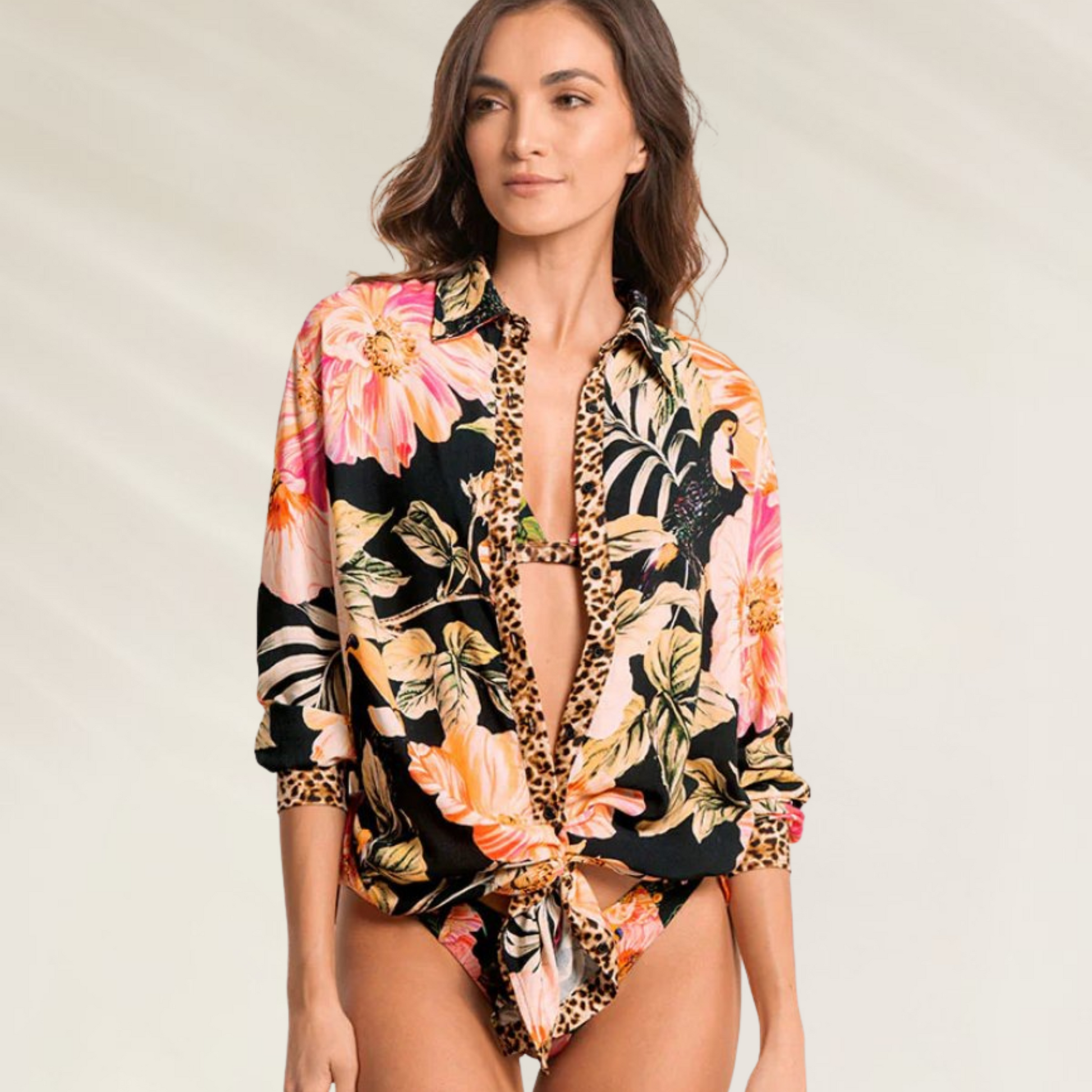 Cette chemise longue est la pièce idéale pour rehausser n'importe quel look de plage d'une touche de sophistication exotique. Dotée d'un motif floral vibrant associé à des détails animaliers et d'un tissu doux et léger, elle offre une infinité de possibilités de style : ouverte, fermée ou nouée pour un effet décontracté.