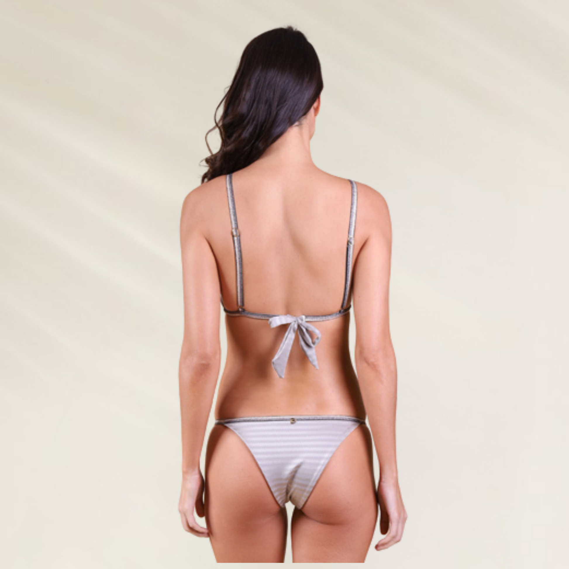 Delicadeza e sofisticação definem este biquíni da Despi. Com top triangular fixo, este modelo oferece almofadas removíveis, alças finas ajustáveis e um elegante laço nas costas que proporciona um ajuste perfeito. A cueca, com corte médio e fitas laterais elásticas, adapta-se ao corpo com leveza e conforto. O tecido em padrão de riscas acetinadas dá um brilho subtil e moderno, ideal para destacar o bronzeado.
