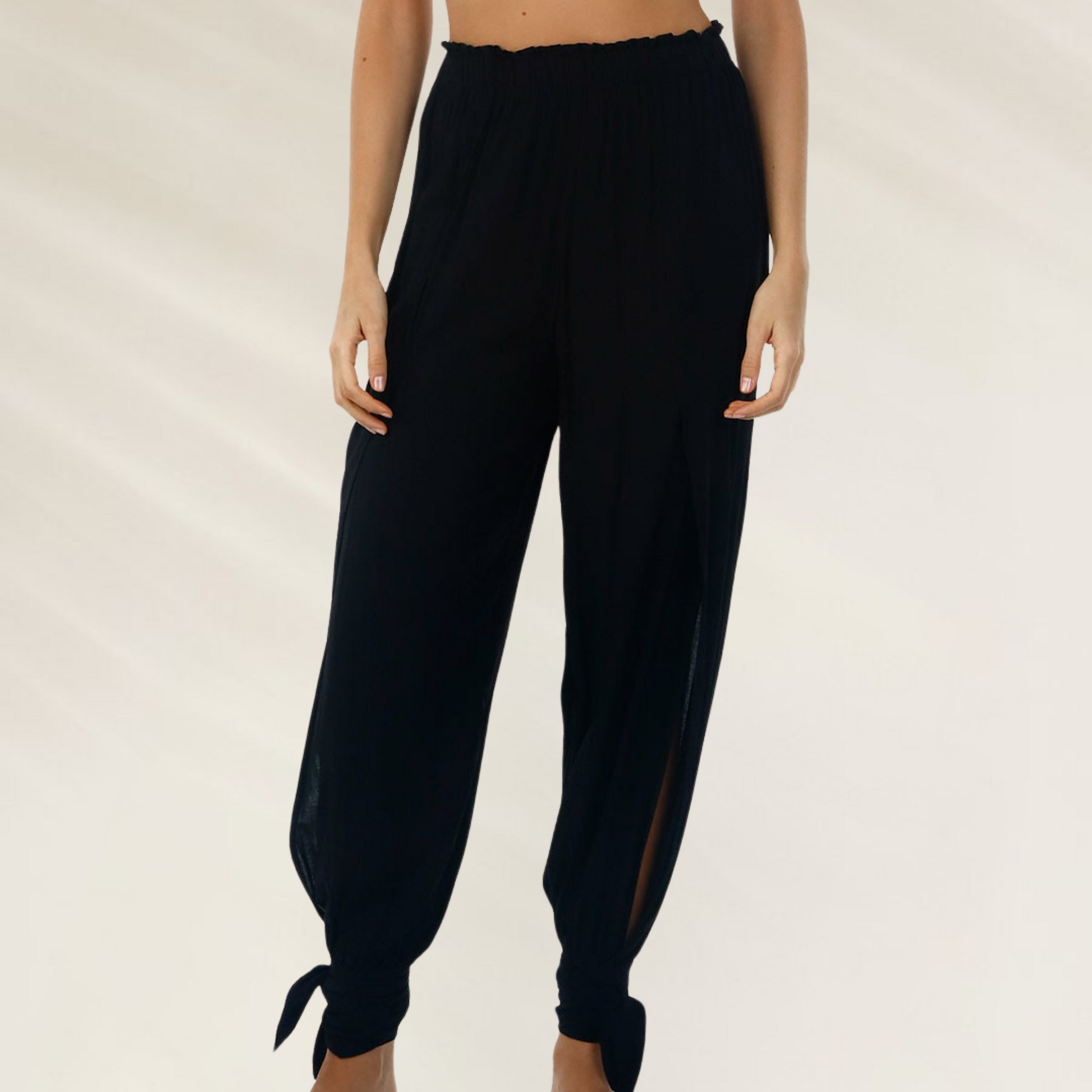 Estas calças compridas pretas da marca Malai são a combinação perfeita entre conforto e sofisticação. Com um corte leve e fluido, apresentam aberturas laterais subtis e detalhe de atar nos tornozelos, criando um movimento elegante e descontraído. A cintura elástica garante um ajuste perfeito e liberdade total de movimentos.