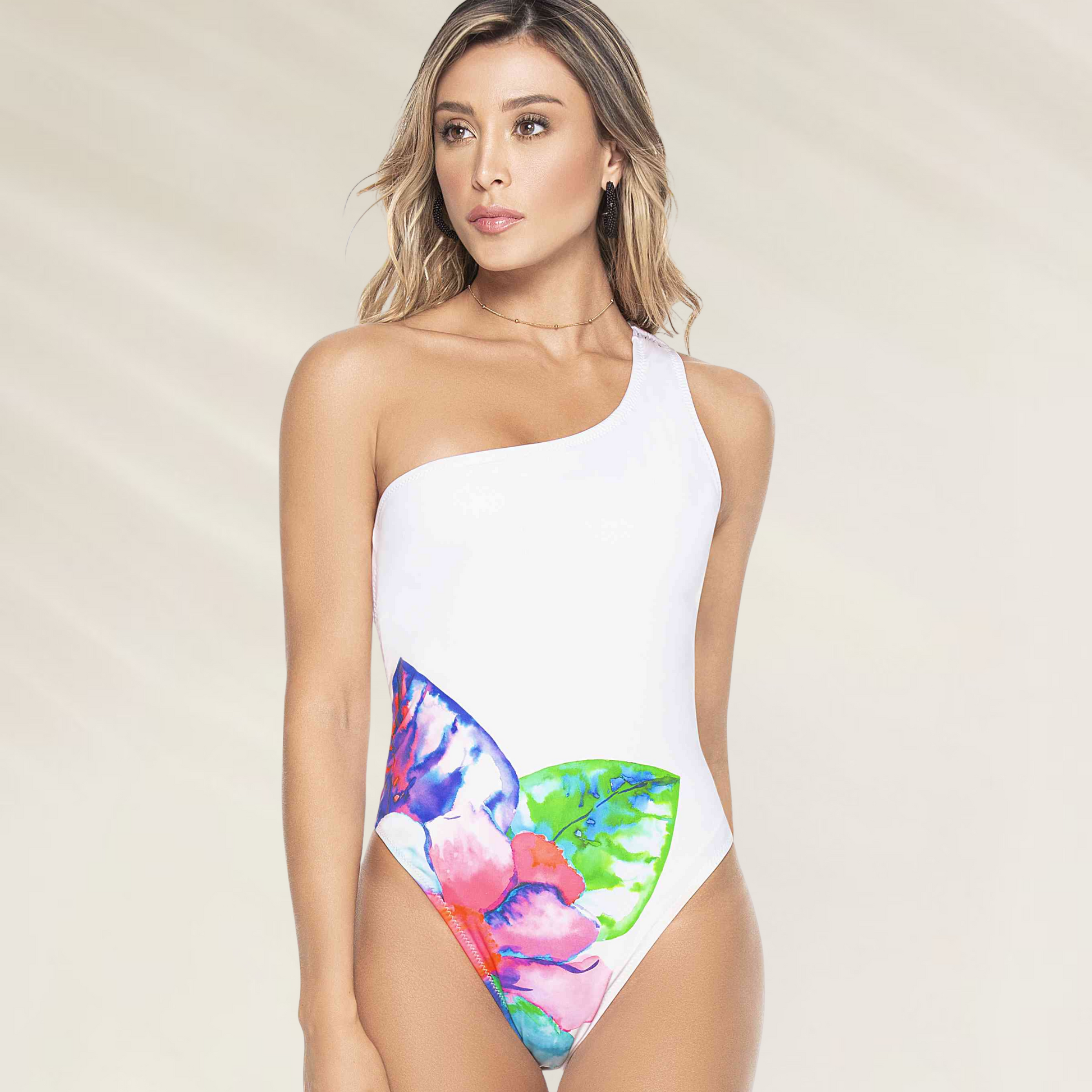 Este sofisticado fato de banho de uma alça da marca Phax destaca-se pelo seu design assimétrico moderno e pelas costas trabalhadas com delicados detalhes em macramé artesanal. Com uma base branca pura e uma vibrante estampa floral aquarelada na parte frontal, é a escolha perfeita para quem procura elegância e originalidade na praia ou na piscina.