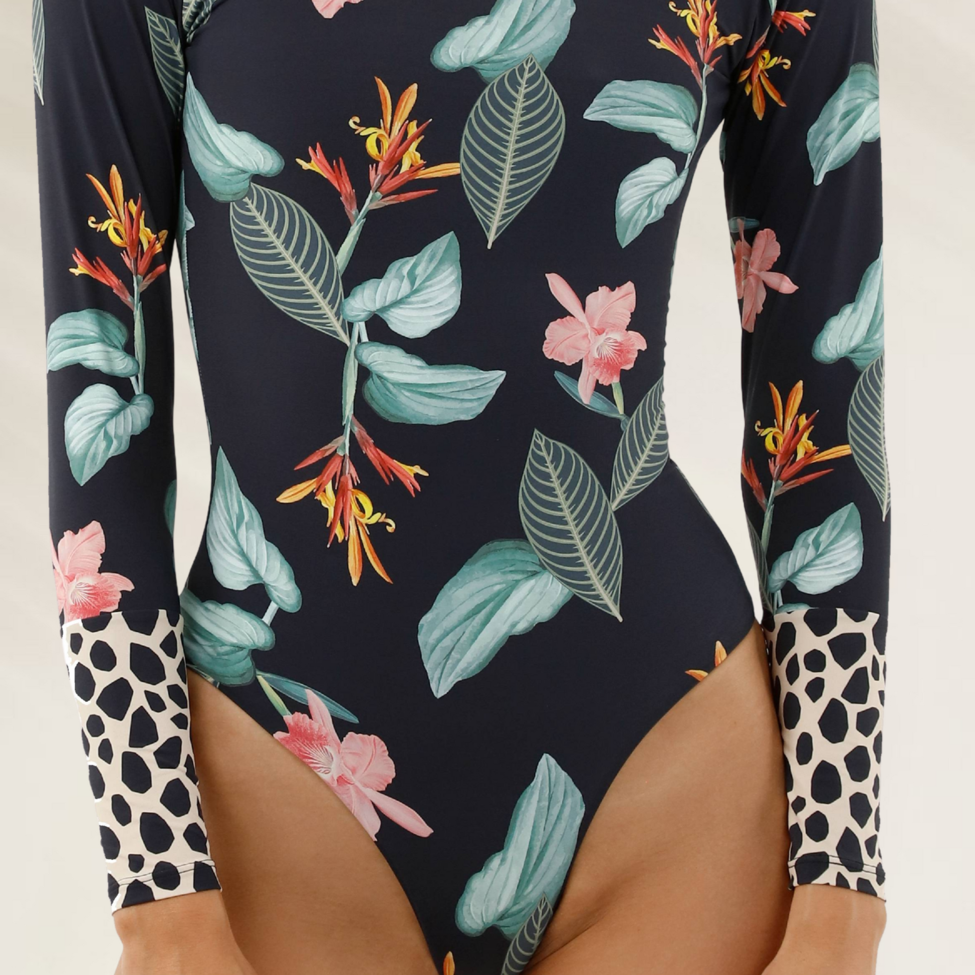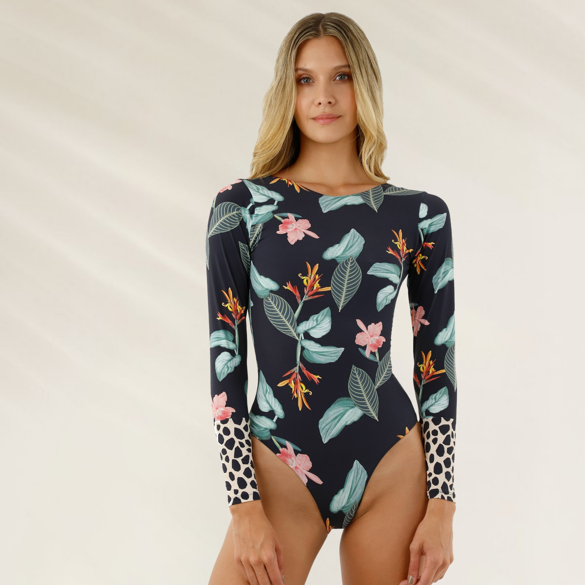 Para quem procura proteção, estilo e performance num só fato de banho. Este modelo de manga comprida da Malai, fabricado na Colômbia, combina um estampado floral tropical vibrante com detalhes contrastantes nos punhos, oferecendo um look moderno e funcional. Ideal para quem pratica Bodyboard, Surf, Paddle e outros desportos aquáticos — ou simplesmente quer um toque de elegância na praia.