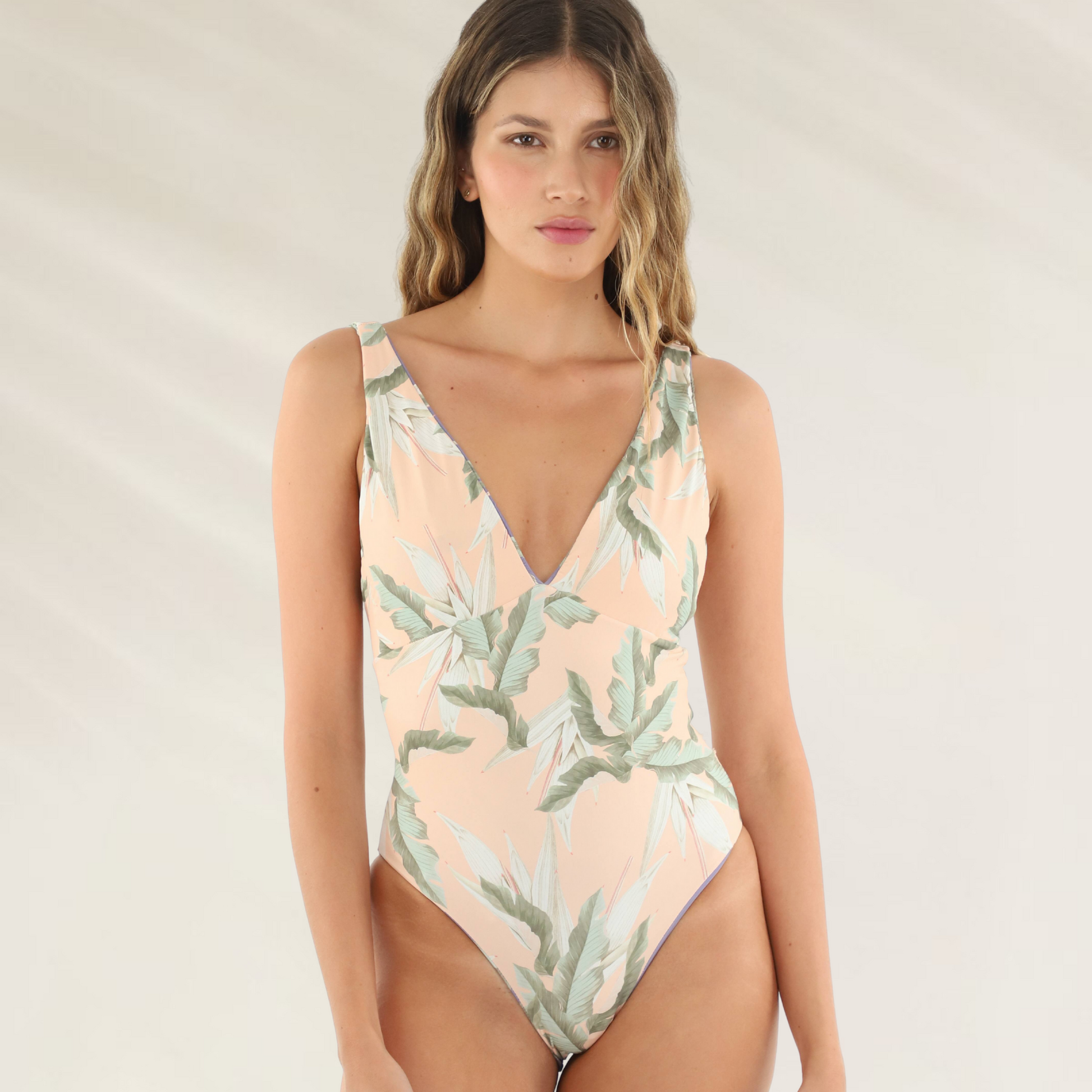 Este elegante fato de banho da Malai destaca-se pelo seu design reversível e padrão tropical exclusivo. Com decote em V profundo, costas abertas e corte de cueca médio, combina estilo sofisticado com conforto e praticidade. Uma peça única que duplica o teu look de praia com apenas uma escolha.