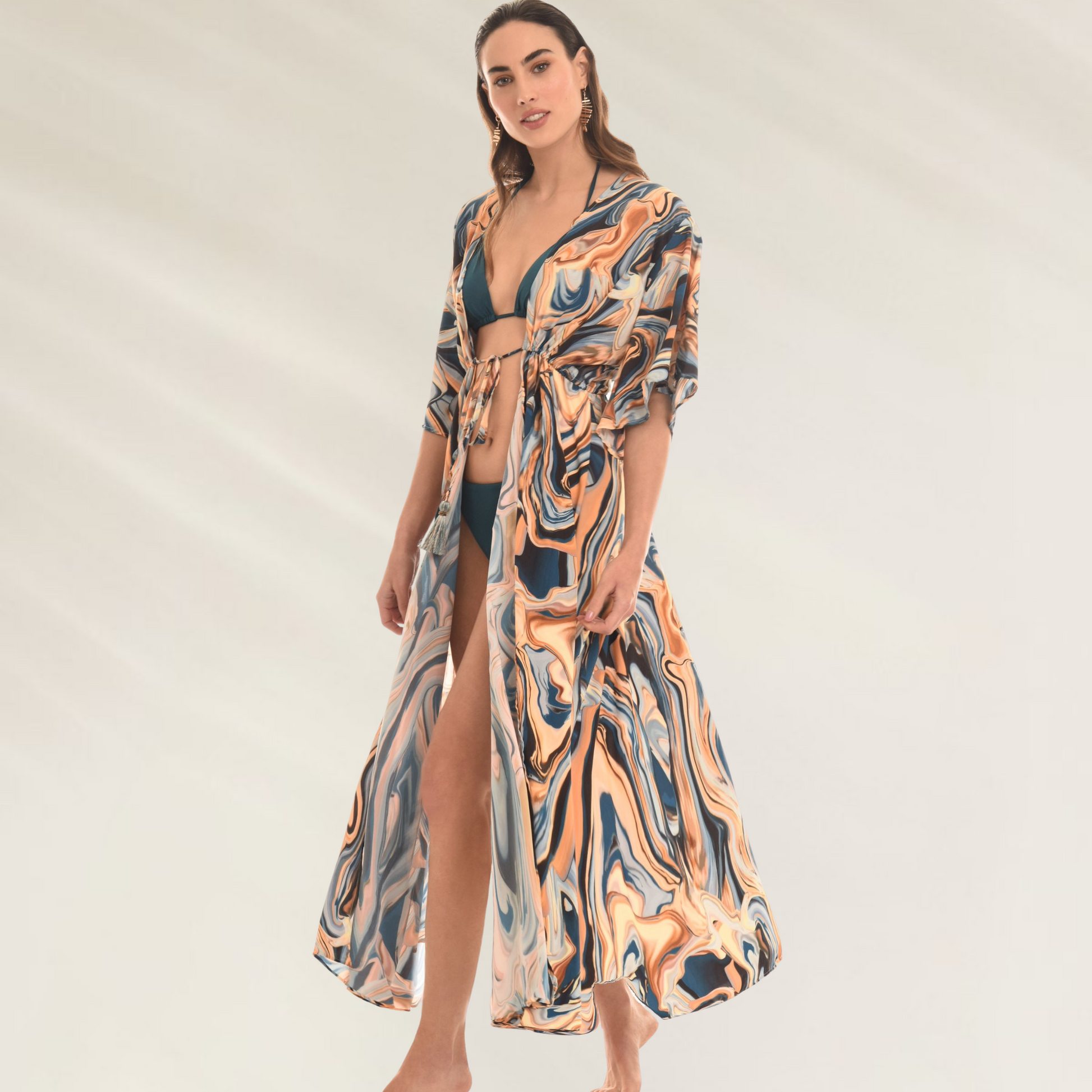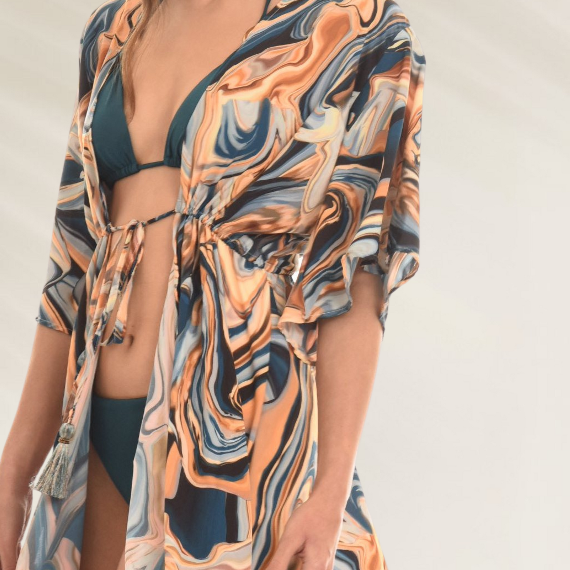 Eleva o teu visual de praia com o elegante Kimono Longo Mystical, uma peça fluída, sofisticada e cheia de personalidade. Com um padrão marmoreado em tons quentes e frios, mangas a meia altura e detalhe em cordão ajustável com pompons, este kimono é o complemento ideal para os teus dias de sol.