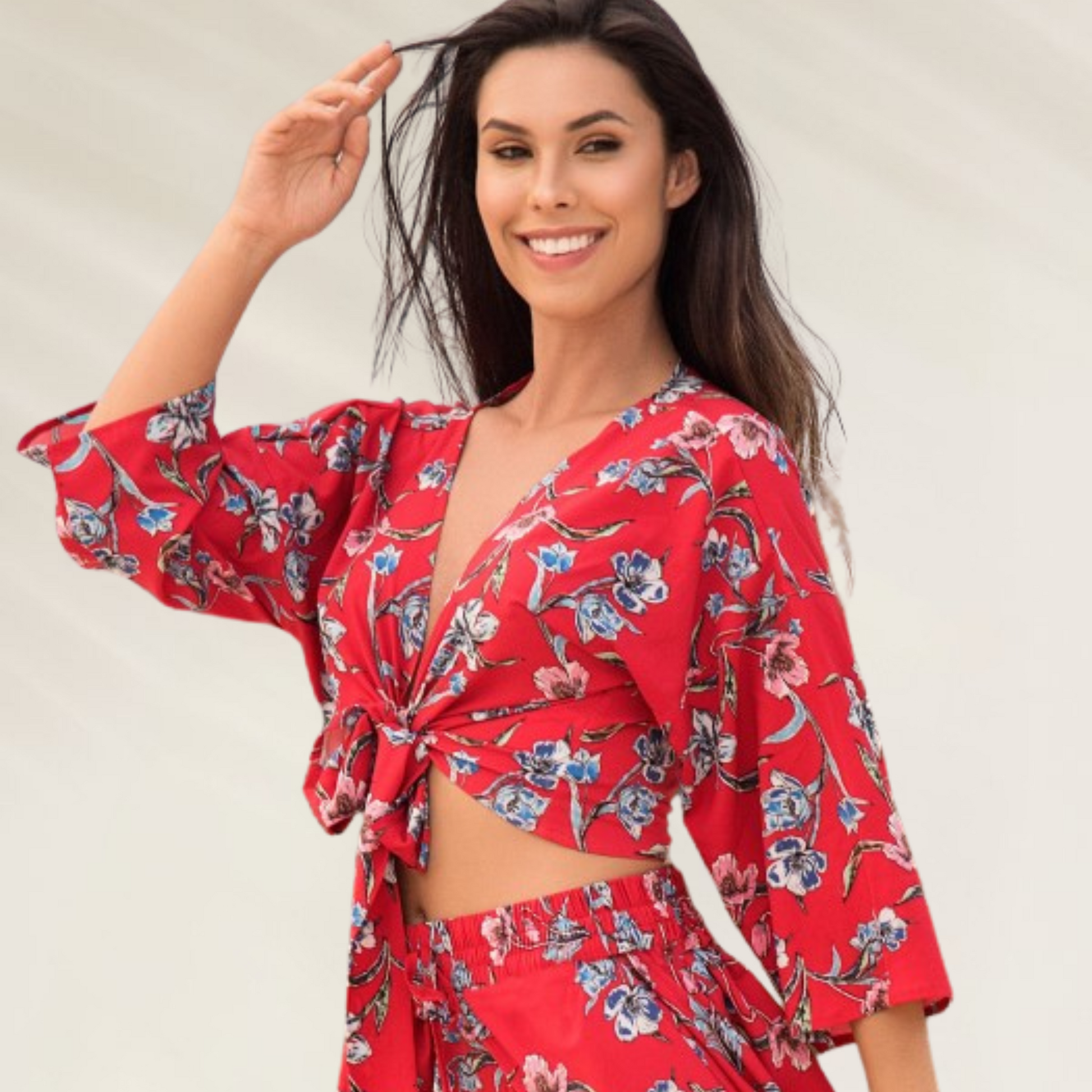 Um top feminino, leve e cheio de charme! Este top curto da Phax combina um estampado floral vibrante com mangas 3/4 e um elegante nó frontal, perfeito para os dias quentes ou para completar o look de praia com muito estilo.