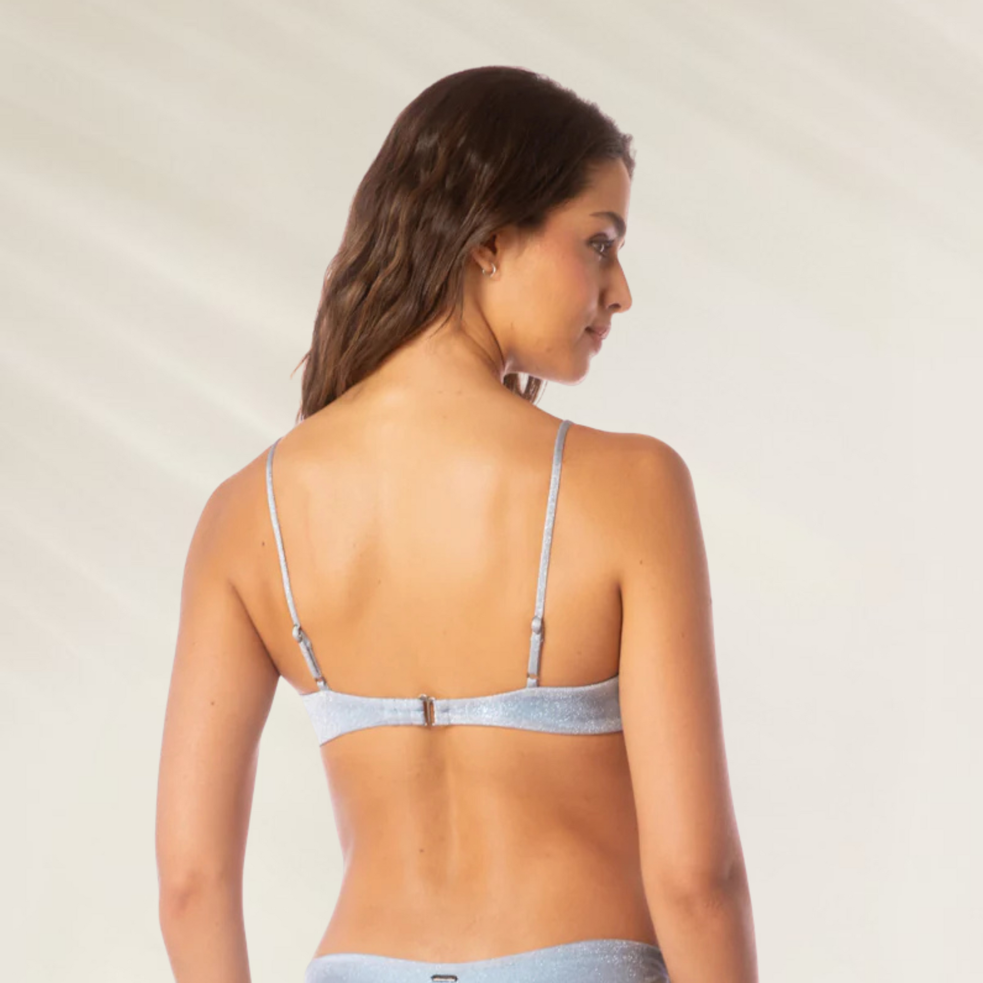 Com um brilho subtil e design elegante, o top Silver Blue Bia da Maaji é a peça perfeita para quem procura sofisticação e versatilidade na praia ou na piscina. O seu tecido canelado com efeito metalizado e o detalhe em arame em forma de “V” ao centro destacam o decote com estilo e discrição.