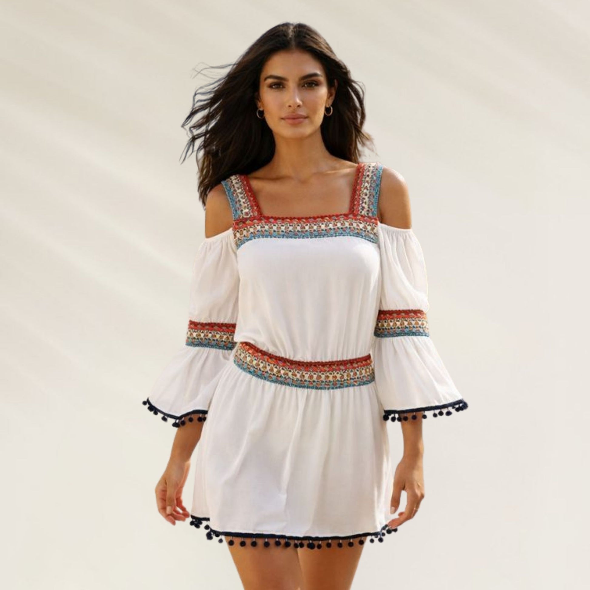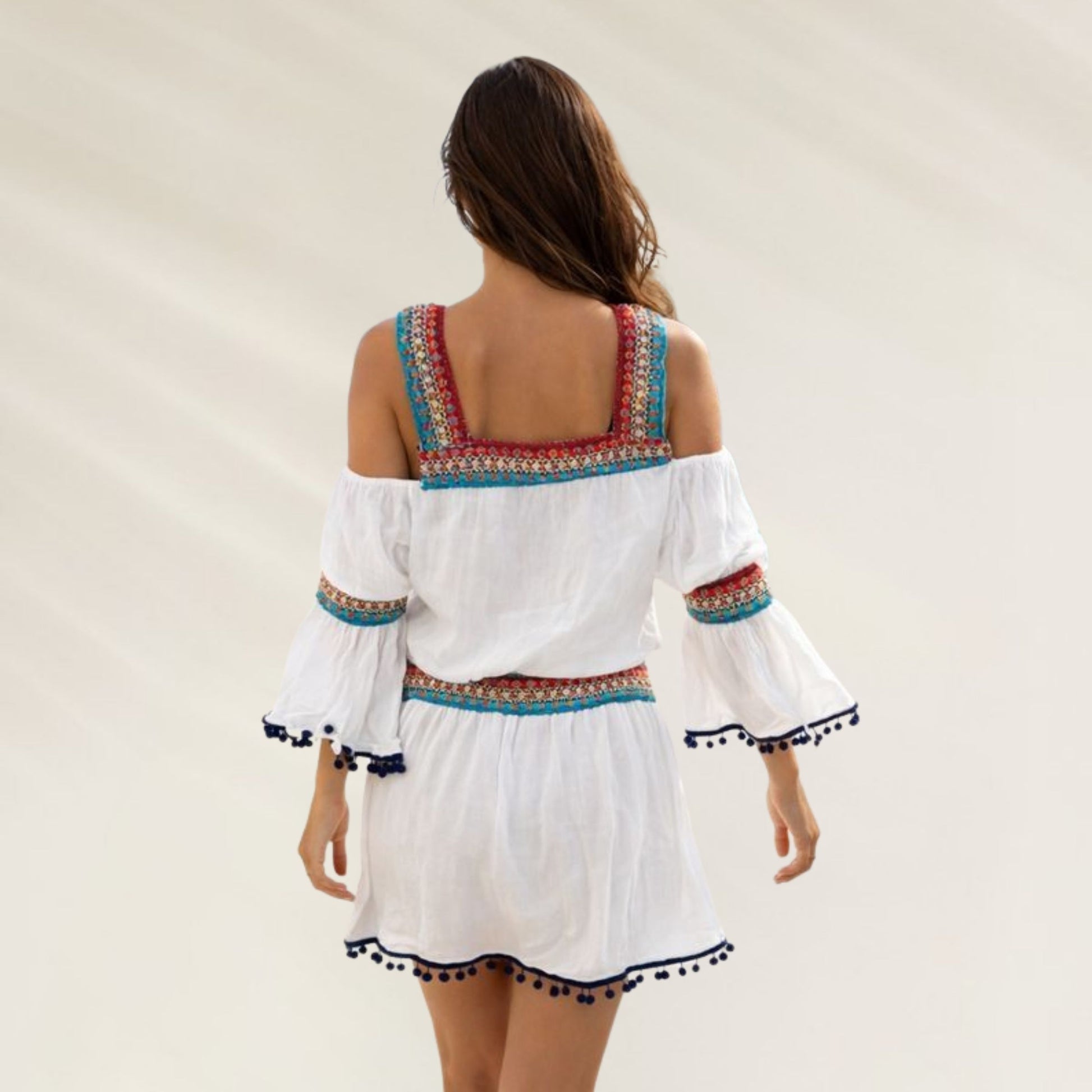 Leve, elegante e cheia de detalhes, esta túnica Despi destaca-se pelos bordados aplicados nas zonas do pescoço, cintura e cotovelos. O seu corte fluido em viscose proporciona conforto absoluto, enquanto os detalhes bordados acrescentam um toque artesanal e sofisticado, ideal para looks de verão.