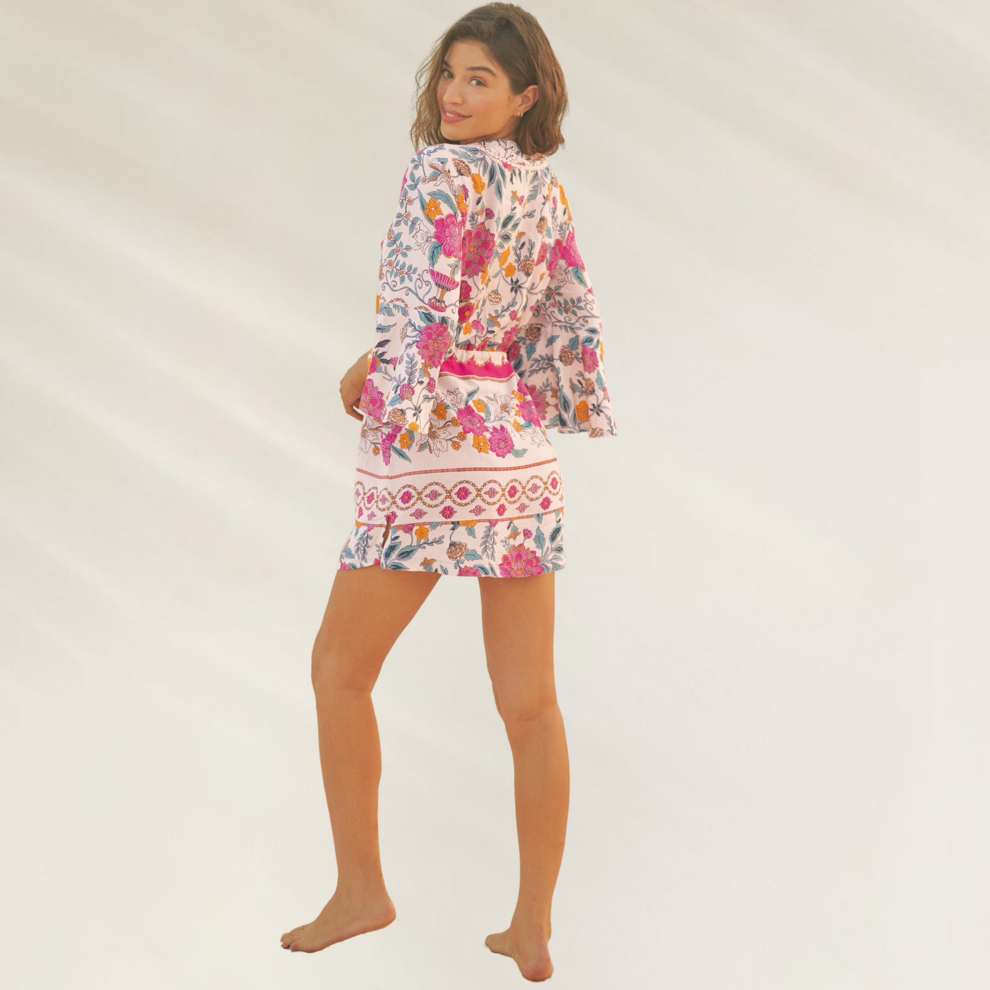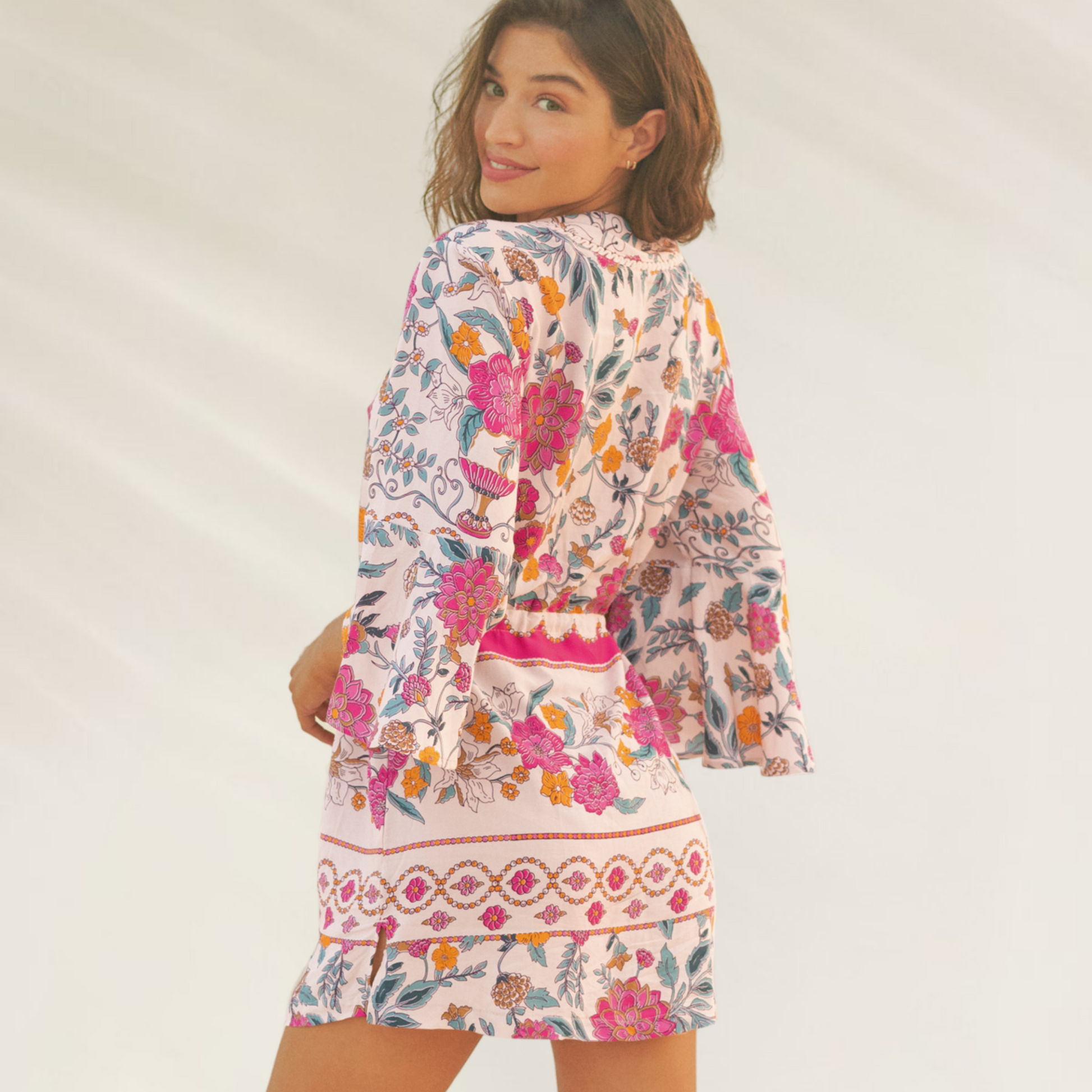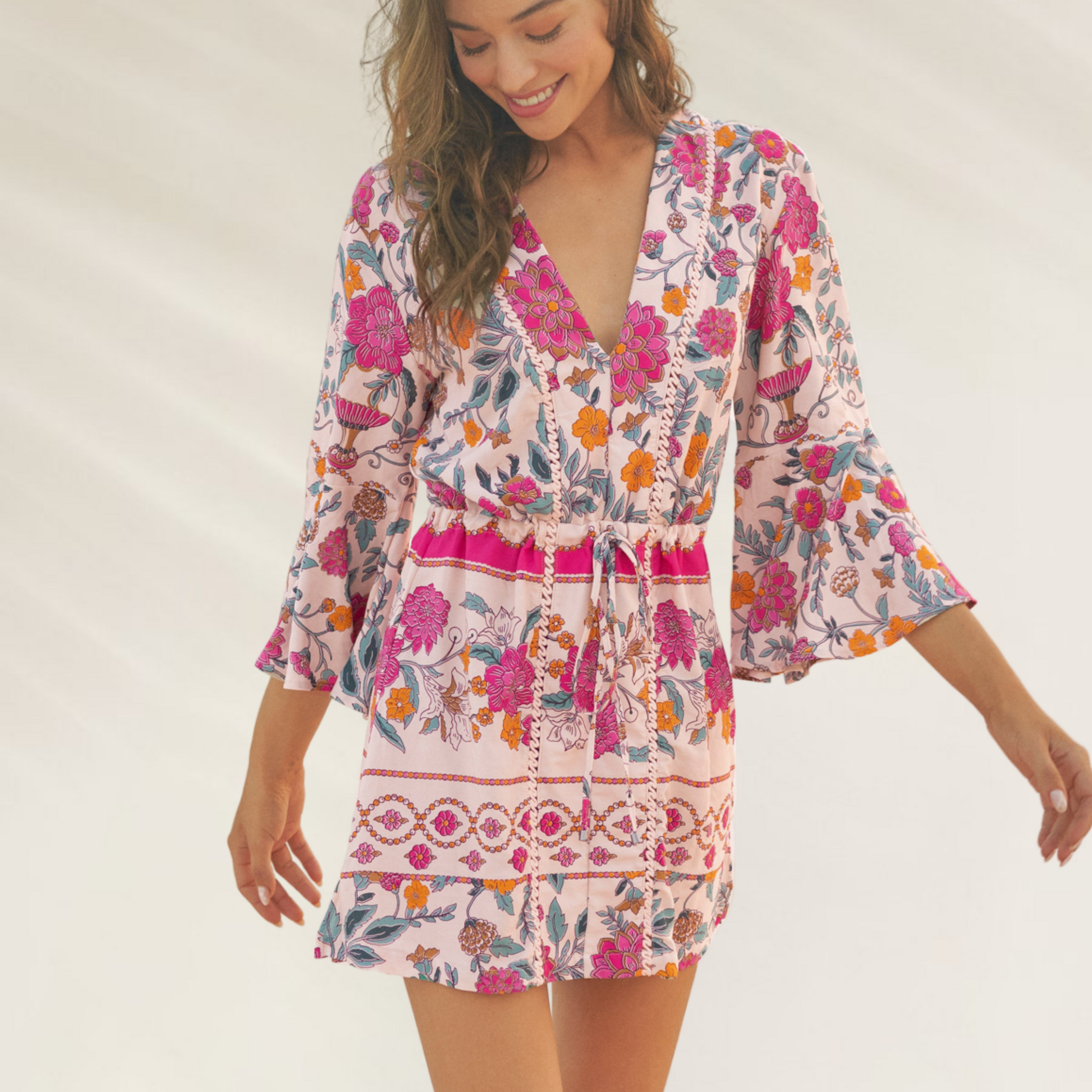 Leve, romântico e irresistivelmente feminino — este vestido curto da Maaji é perfeito para os dias de verão. Com um decote em V elegante e mangas 3/4 com ligeiro volume, destaca-se pelo seu print floral multicolorido e detalhes delicados na frente, que lhe conferem um charme único. O ajuste na cintura com laço permite um fit confortável e favorecedor.
