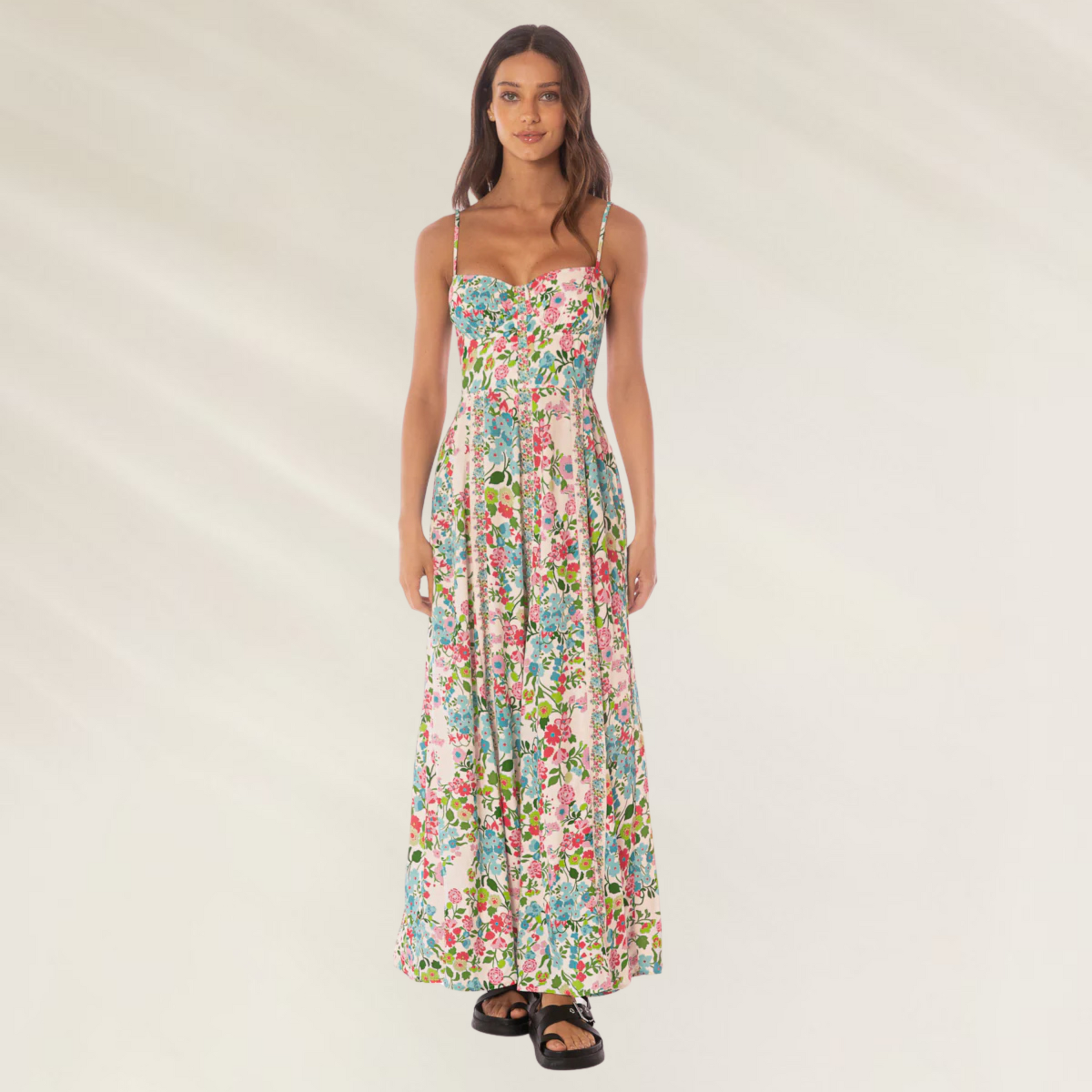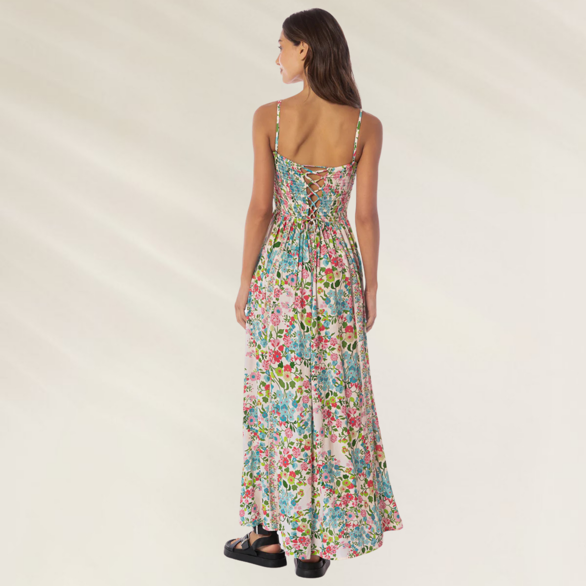 O vestido Romina é pura elegância em forma de flores. Com um corte que realça a silhueta, copas com aro para maior suporte e um detalhe de atar nas costas que oferece ajuste perfeito, este vestido longo é ideal tanto para passeios na praia como para eventos ao pôr-do-sol. O estampado floral vibrante transmite frescura e feminilidade – uma verdadeira peça statement da nova coleção Maaji.